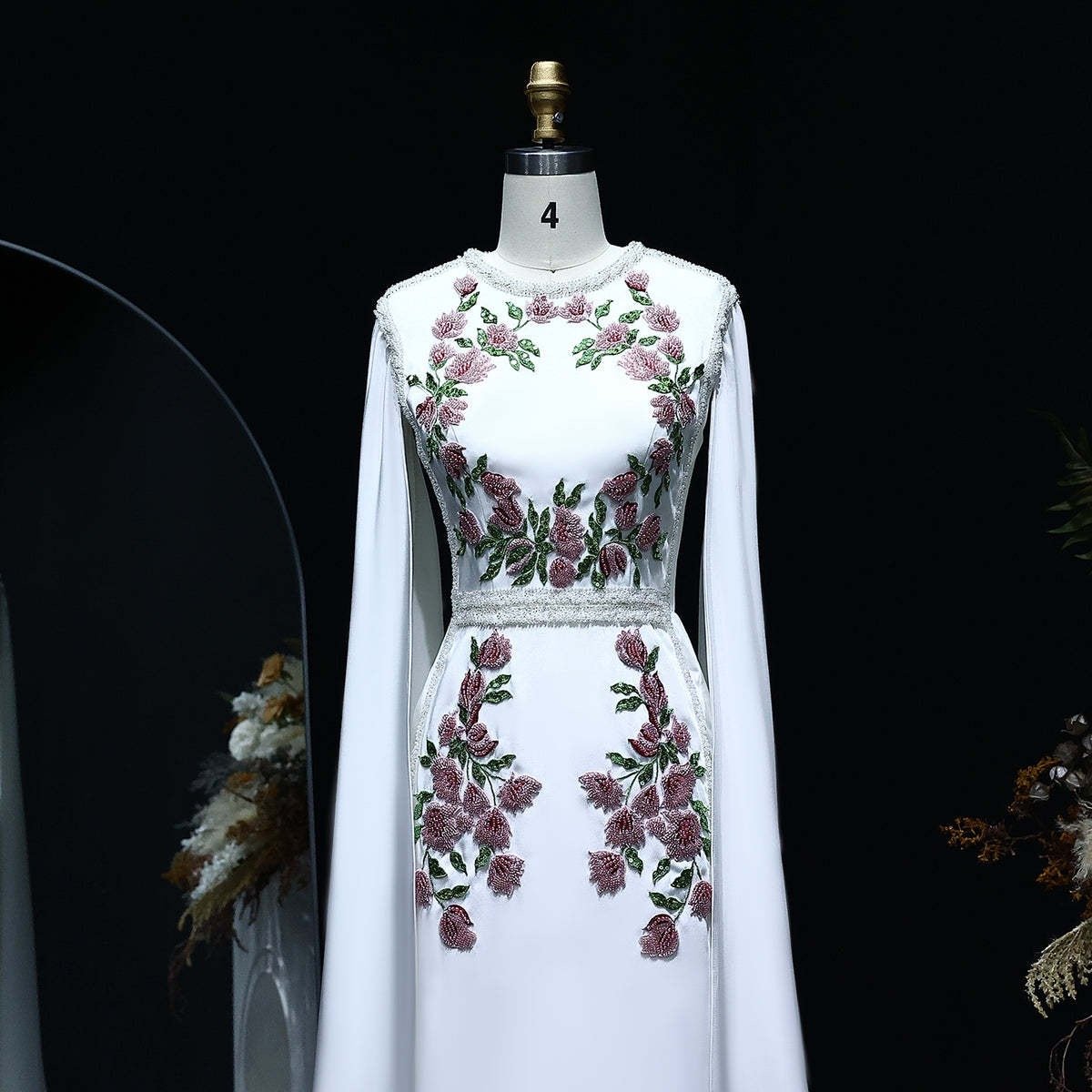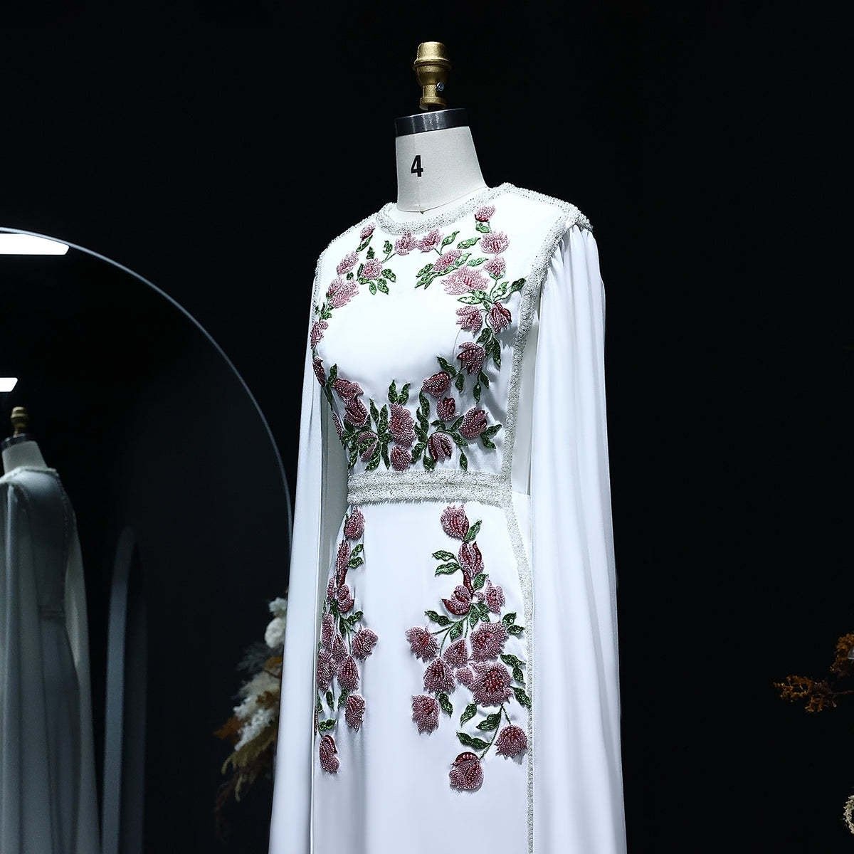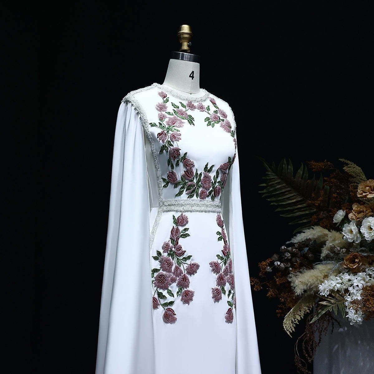 Embody timeless elegance with the Graceful White Floral Embroidered Gown with Flowing Cape Sleeves. This sophisticated dress features delicate floral embroidery in rich tones of purple and green, gracefully scattered along the bodice and skirt, offering a romantic and feminine touch. The floor-length design flows seamlessly, while the dramatic cape sleeves create an ethereal look, perfect for formal occasions, weddings, and gala events. Crafted from luxurious fabric, this gown combines opulence with modern style, ensuring you stand out as a vision of grace and beauty.